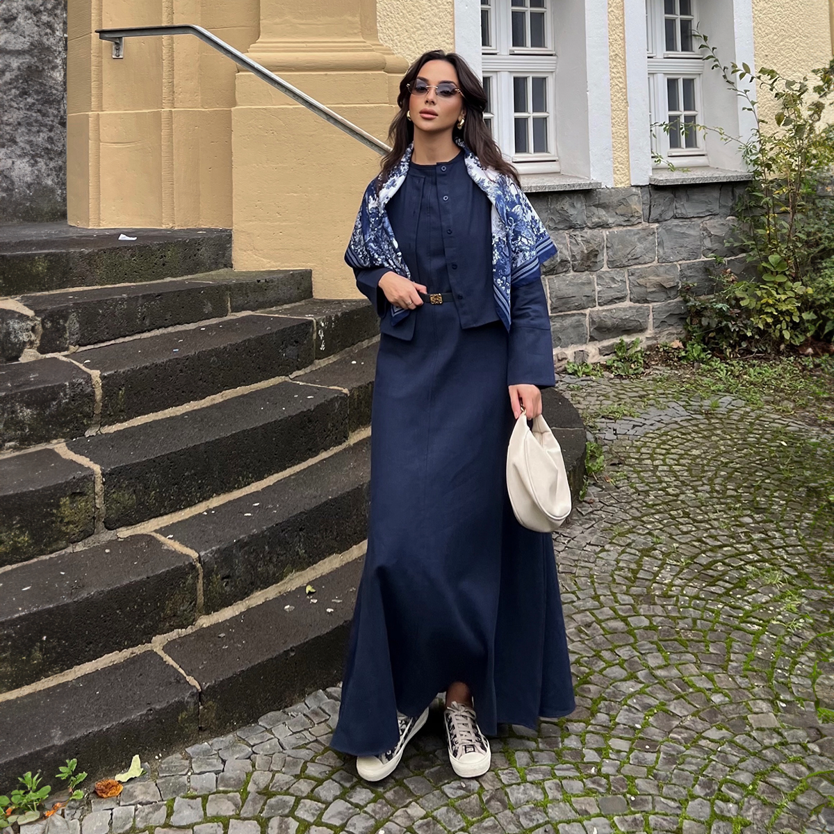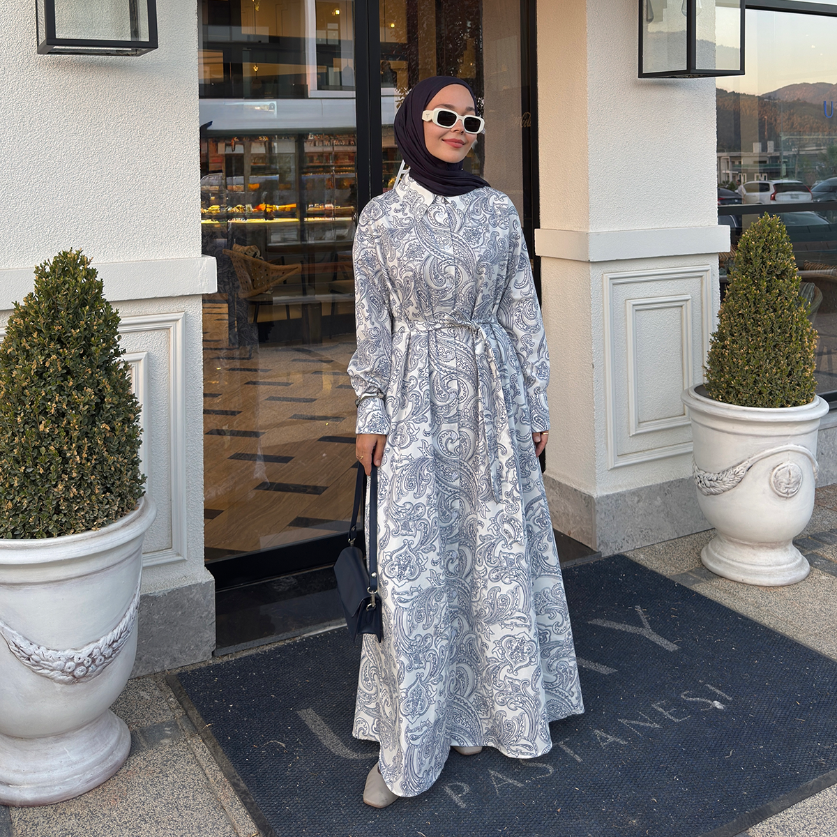 Kadın Poplin Gömlek Elbise Paisley Desen Lacivert