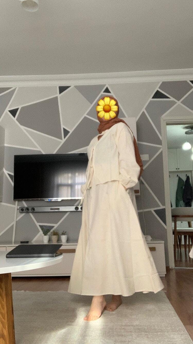 Geniş kesimli etek ve bağcıklı üst detayı ile minimal ama etkileyici bir duruş yakalayın. Hem şehir hayatında hem de özel anlarınızda doğallığın şıklığını yaşayın.