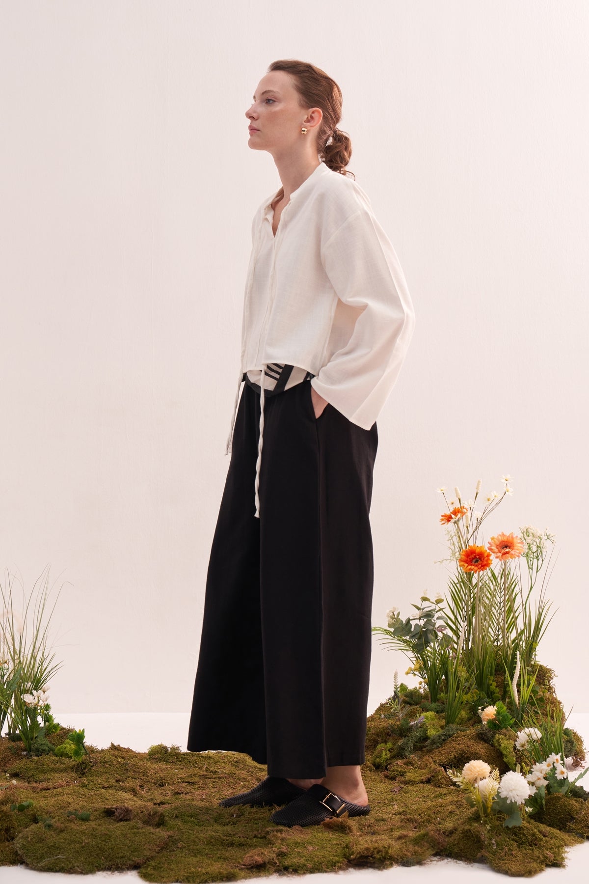 Bol kesimi ve ekstra geniş paçalarıyla adeta bir etek görünümü sunar; bu da ona benzersiz bir siluet ve zarif bir hareket kazandırır. Pantolonun etek görünümü, özellikle hareket hâlindeyken akışkan bir etki yaratarak fark edilir bir stil kazandırır.