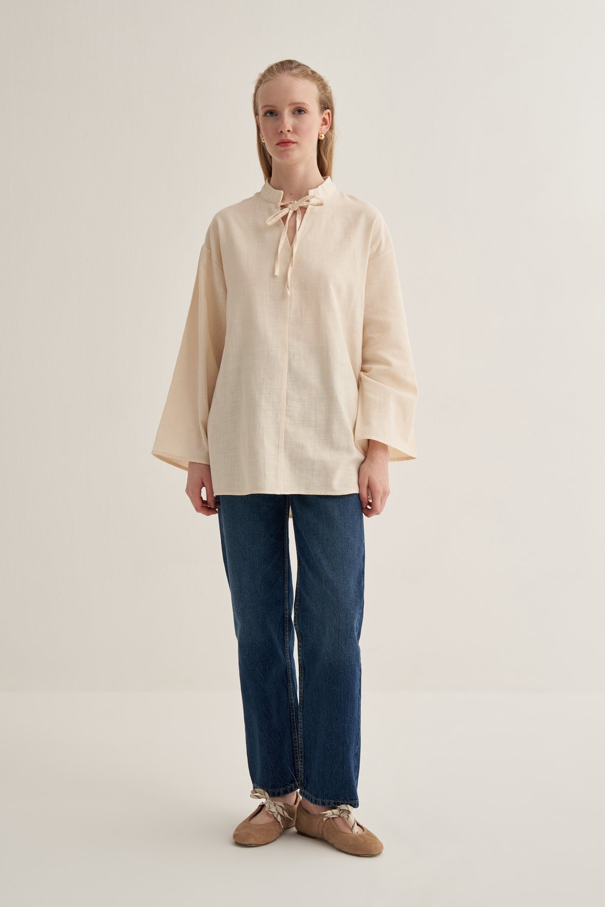 Organik Pamuk V Yakalı Bluz bol kesimli, V yaka tasarımlı ve yakası bağlama detaylı bu uzun kollu bluz; düşük omuz formu ve yandan yırtmaçlı modeliyle hem modern hem de rahat bir görünüm sunuyor.