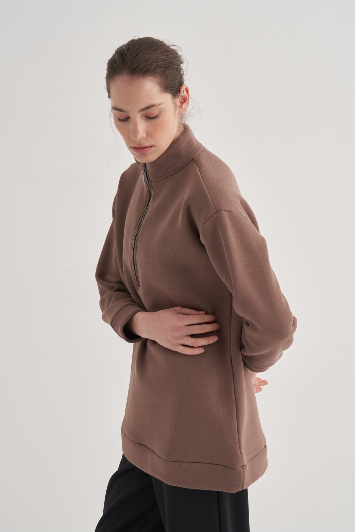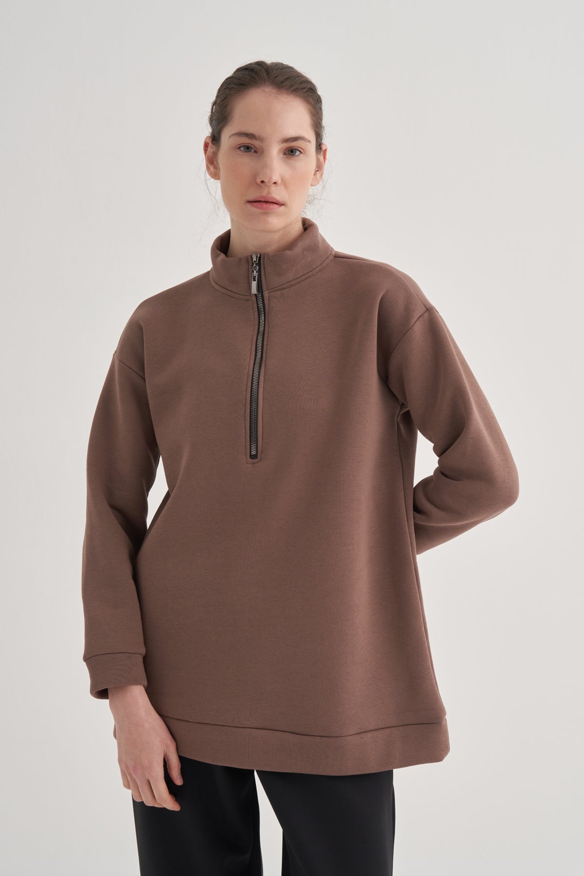 Kadın Yarım Fermuarlı Şardonlu Sweat Kahve